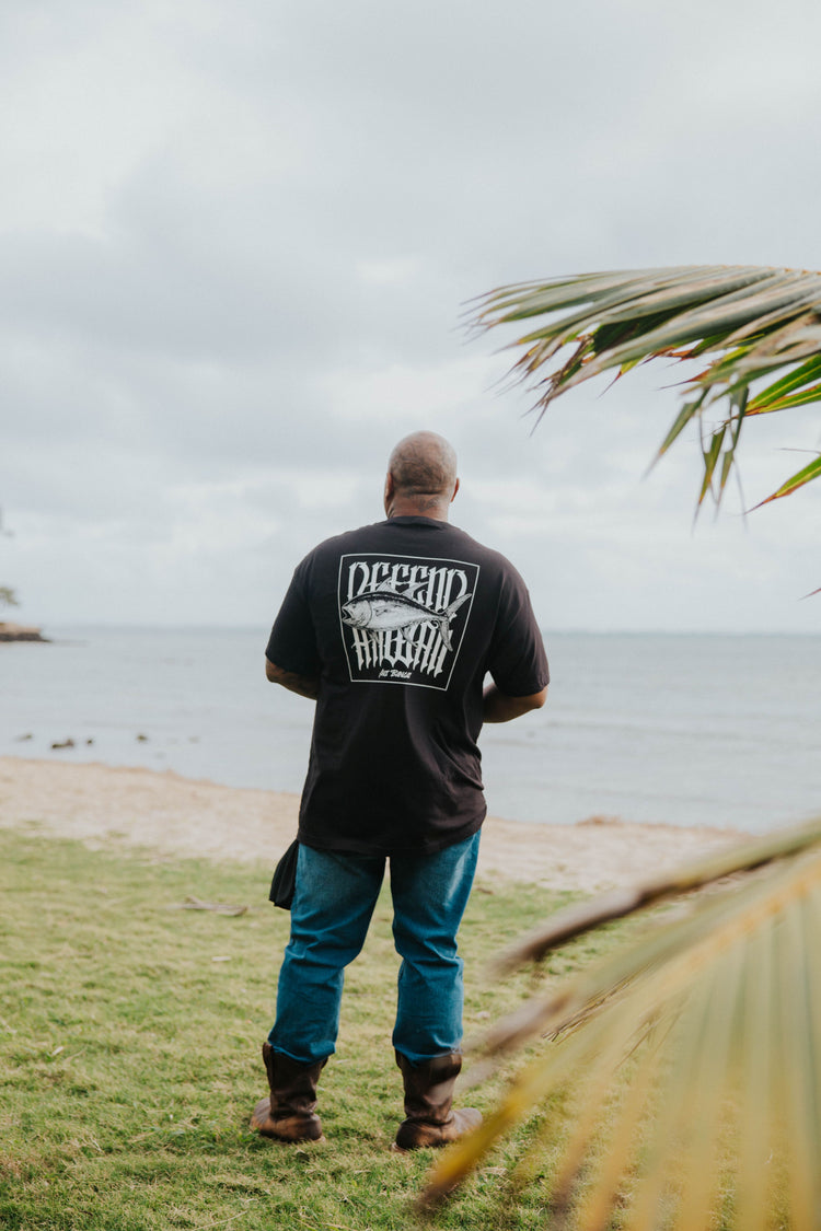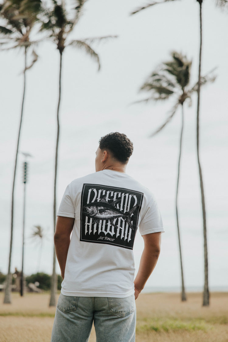 Defend Hawai'i - This fish is so fresh, the ink is still wet. We're sharing our gyotaku with you in this Ahi Bangah. Featuring a clean cut pocket hit and a bangah of a back hit. Pick your favorite color way. This one is available in white ink on black, black ink on white, or black ink on stonewash green regular fit tee.