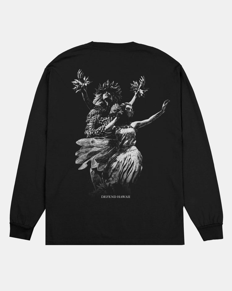 Defend Hawai'i - An homage to hula, our Kahiko & 'Auana design has been elevated to meet our Hula Dreams. This is a tribute to old, current, and the future of Hawai'i. Pick your favorite colorway, this one comes in white and gray ink on a black casual-fit longsleeve.