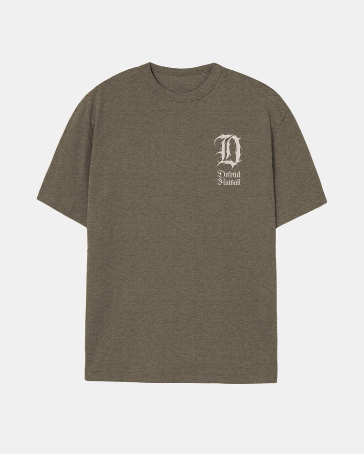 Defend Hawai'i - There's something about the Ali'i Po'o that always gives you a sense of pride. This time as a veteran rebel. This is D-Rebel. Featuring a clean pocket hit and roaring back hit. Pick your favorite colorway. This one comes in gray, brown, and white ink on a black or heather olive casual fit t-shirt. Your everyday tee to DEFEND with.