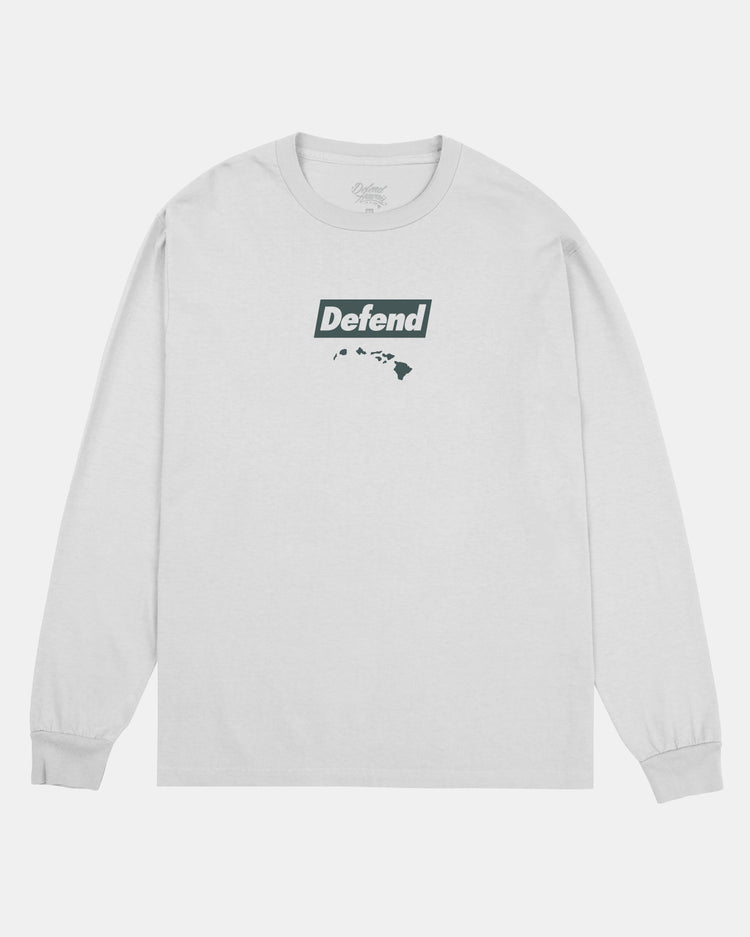 Defend Hawai'i - Hiding in plain Kalo sight, this is Kaloflage. Featuring a simple center and flourishing back hit. Pick your favorite color way. This one comes in green and gray ink on a white casual fit long sleeve.