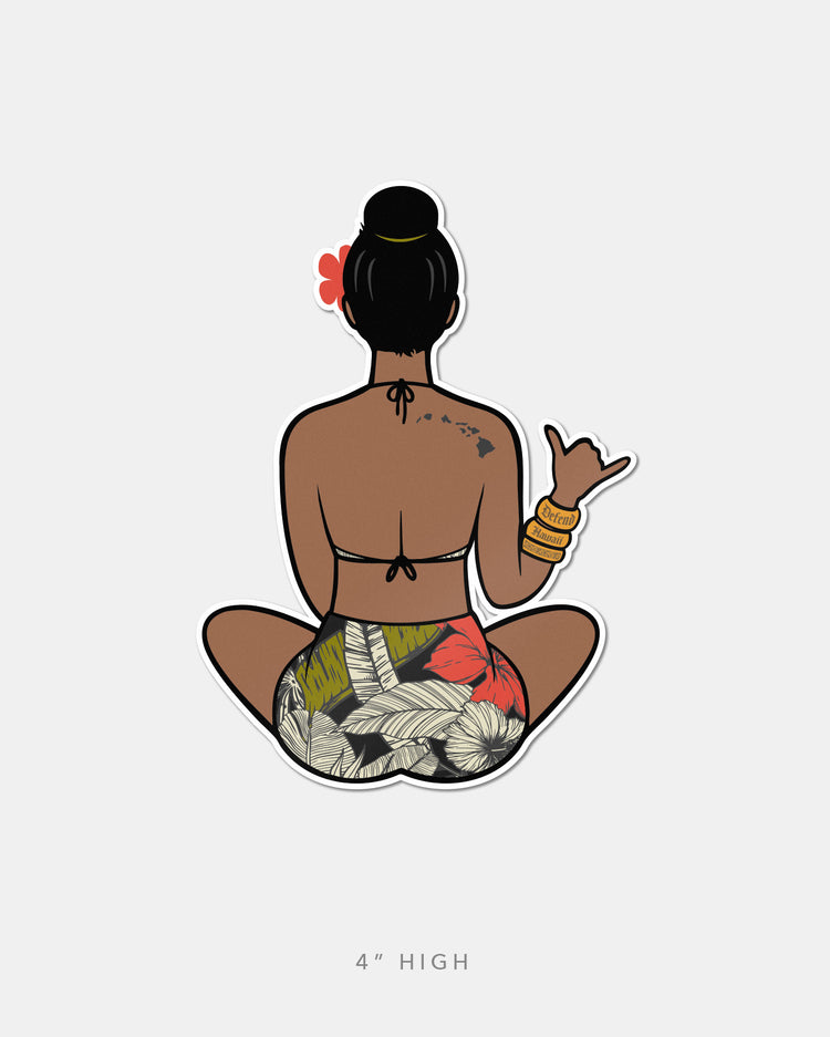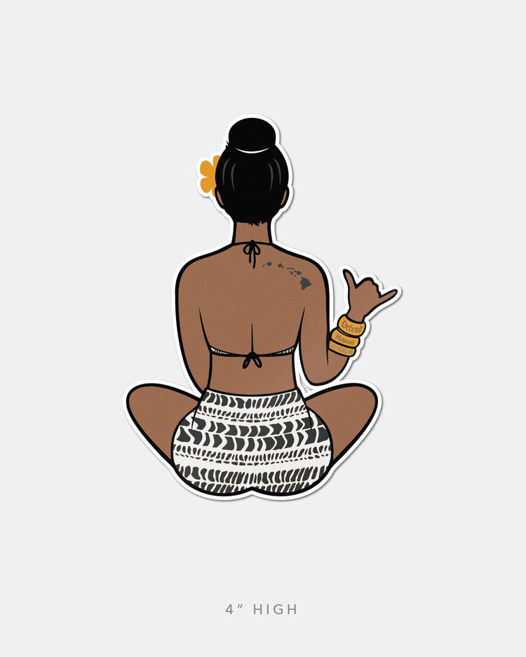 Defend Hawai'i custom die-cut stickers. Collect um, share um, slap um! Cheee! This one is a new version of our popular Ku'uipo design. Check her back tat and outfit changes! You'll probably just want this for everything.