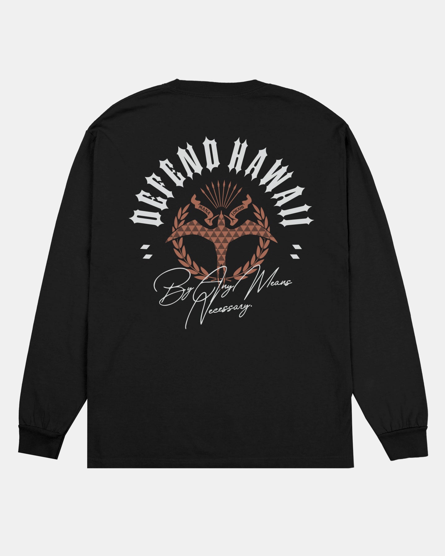 Defend Hawai'i - Using our power as a reminder-Defend Hawaii By Any Means Necessary. This is, Suncrest. Featuring a pocket hit and an Iwa bird centered back hit. Pick your favorite colorway, this one comes in white and orange ink on a black casual fit longsleeve. Your everyday tee to DEFEND with.