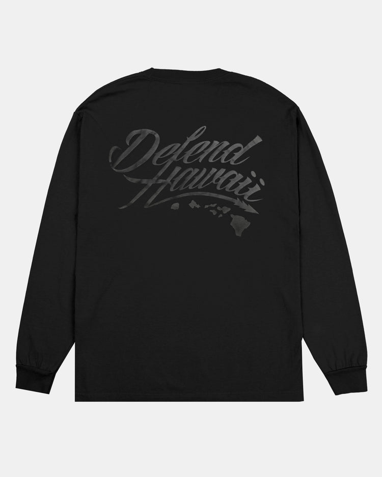 Defend Hawai'i - The iconic, never duplicated, stapled Wildstyle 'Elua logo. Featuring a subtle pocket hit paired with a mayjah back hit, this time puffed to perfection. This one comes in black puff ink on a black casual fit long sleeve. Your everyday tee to DEFEND with.