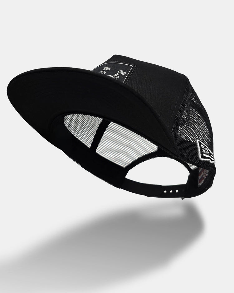 Defend Hawai‘i - An homage to the palace, this is Iolani Forever. Embroidered in white on a black flatbill trucker. This one is a black cotton meshback snapback hat, with a black crown, black eyelets, black brim, and button with a snap closure.