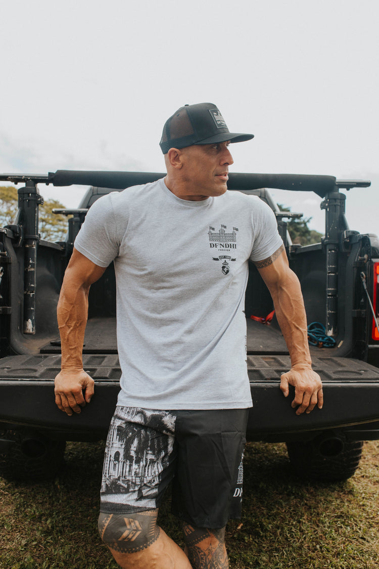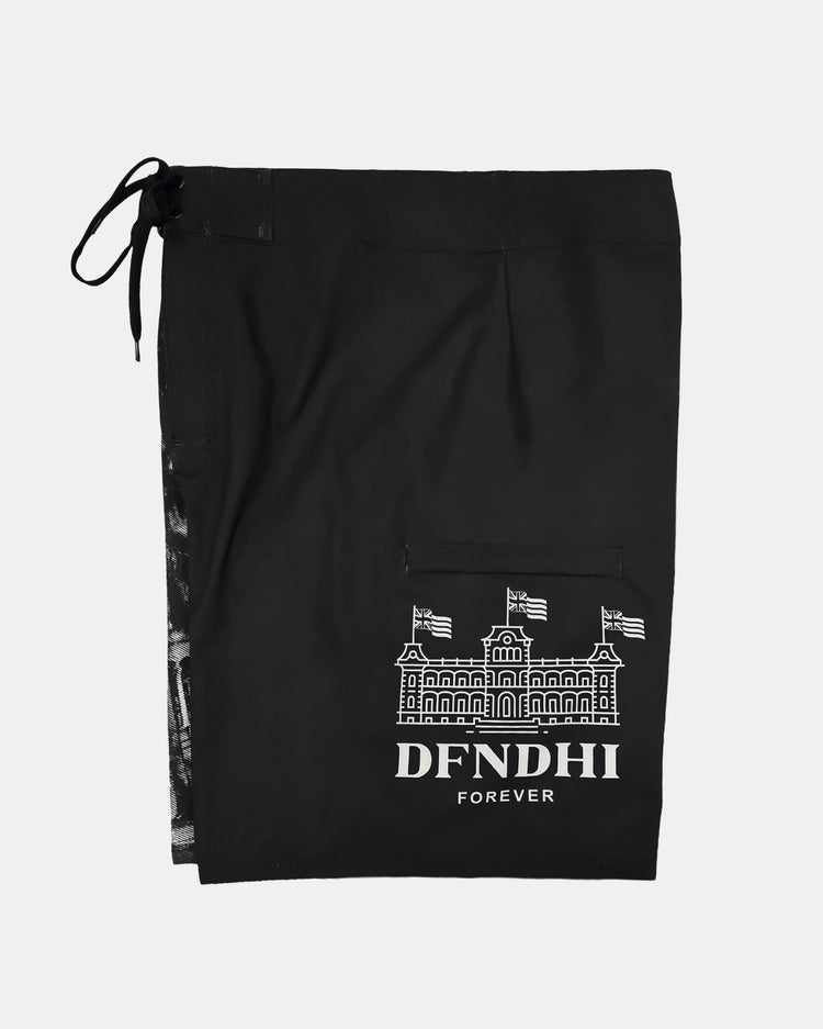 Defend Hawai'i - Introducing our Iolani Forever boardshort design. Featuring a snapshot of history on the left leg and a black sleeve on the right. The usual woven label in the back for hang drying!