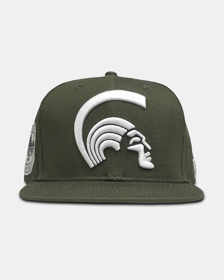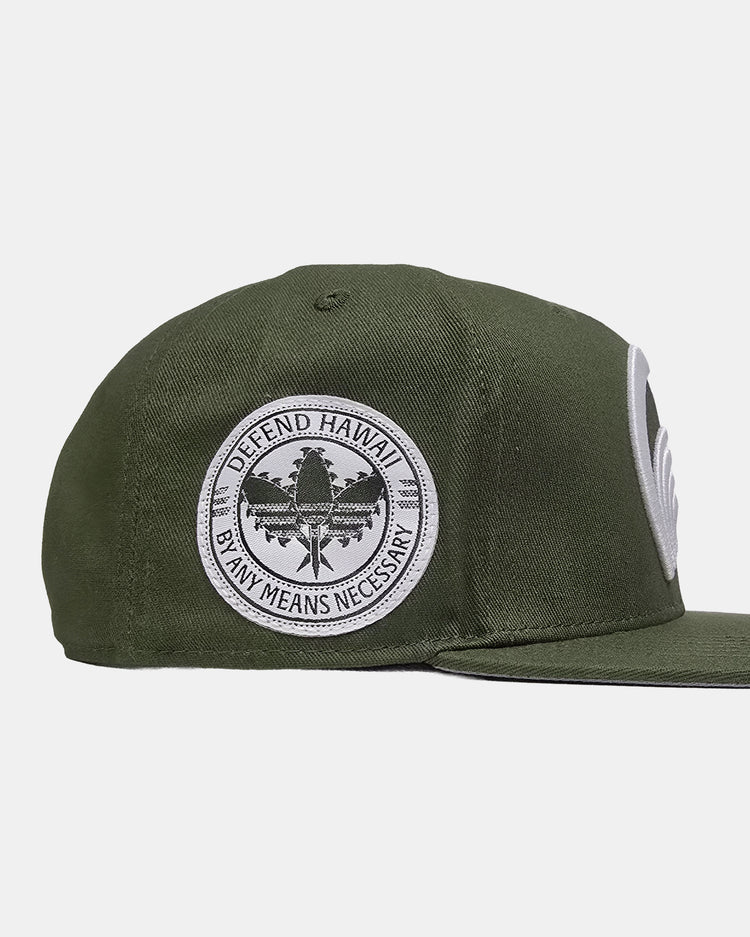 Defend Hawai‘i - Our crown worthy Milly Boomski design is back in a new color combo. Our classic Ali'i Po'o logo embroidered in white on a military green flatbill snapback. A hae Hawai'i (Hawaiian flag) patch embroidered on it's side. This one is a cotton snapback hat, with a green crown, green eyelets, green brim, and button with a snap closure.
