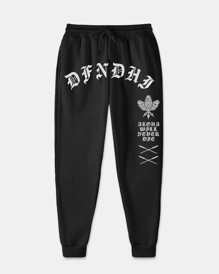 Defend Hawai'i - Stay ready, don't need to get ready. This one is Battle Ready. Featuring a wrap front and center paired with a hit down the left sleeve. Pick your favorite colorway. This one comes in white ink on a black midweight fleece jogger pant.