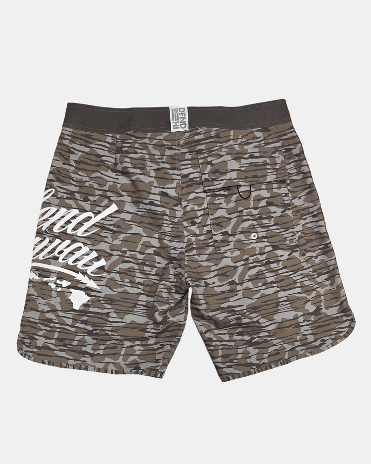 Defend Hawai'i - A classic neutral camo boardshort design for everyday life. Featuring an island style camo pattern and you can't miss the white Wildstyle logo on the side leg. This is Wildstyle Islands Camo Boardshort.