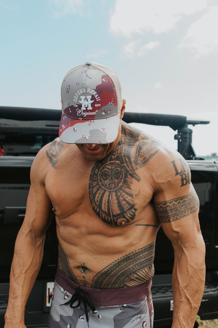 Defend Hawai‘i - The beloved H Spear design reworked for the Iʻiwi bird. This is ʻIʻiwi Desert, embroidered in white on a desert camo a-frame snapback. This one is a desert camo cotton a-frame snapback hat, with a desert camo crown, tan  eyelets, desert camo brim, and button with a snap closure.