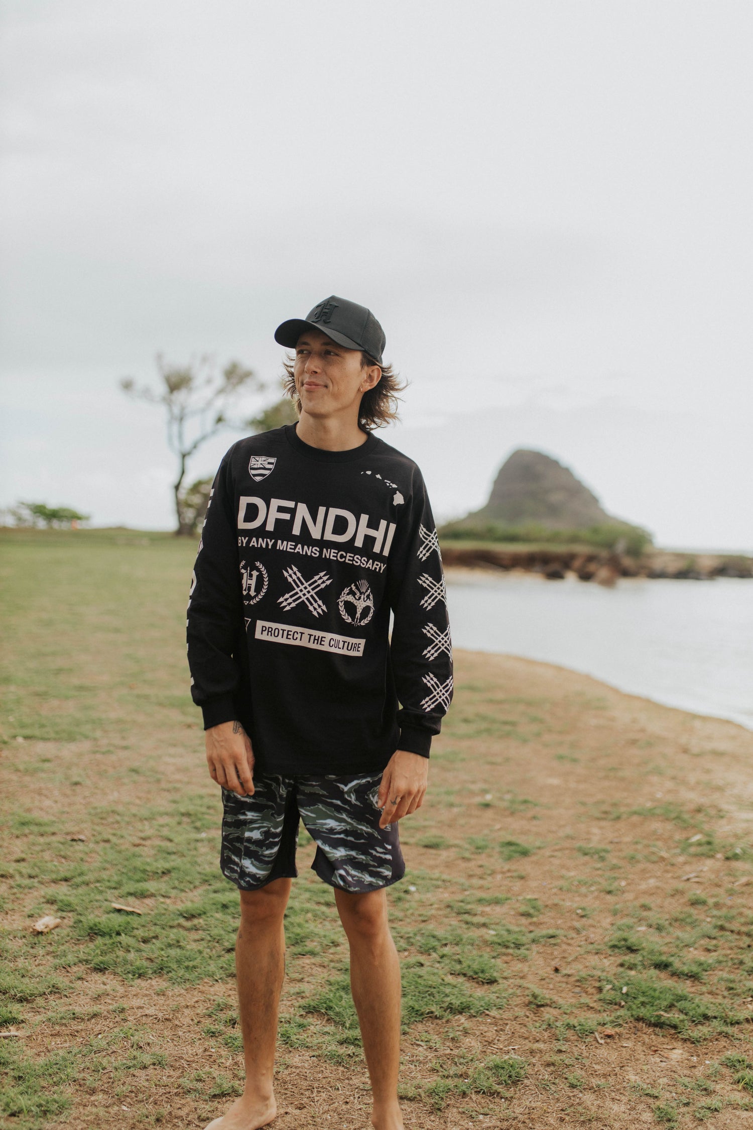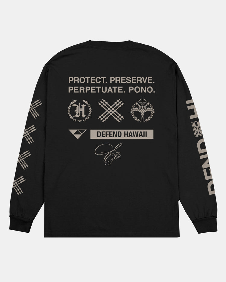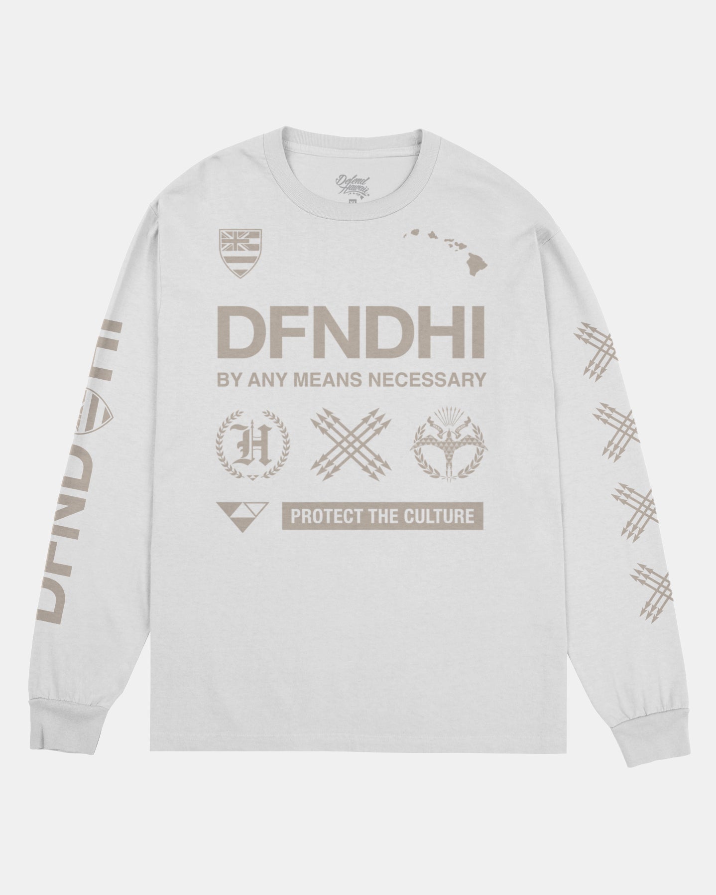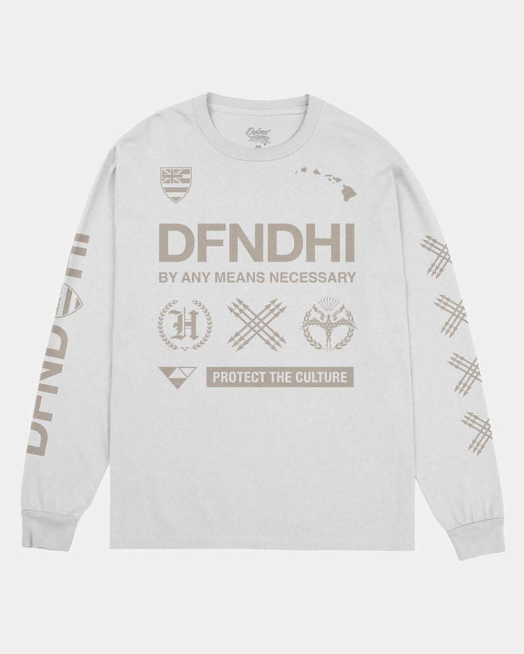 Defend Hawai'i - A full DH logo run, a reminder to protect the culture, by any means necessary. Back with an all over design, this is Protector. Featuring a full chest and back hit, don't miss the double sleeve hit. Pick your favorite colorway. This one comes in light tan ink on a black or white casual fit long sleeve. Your everyday tee to DEFEND with.