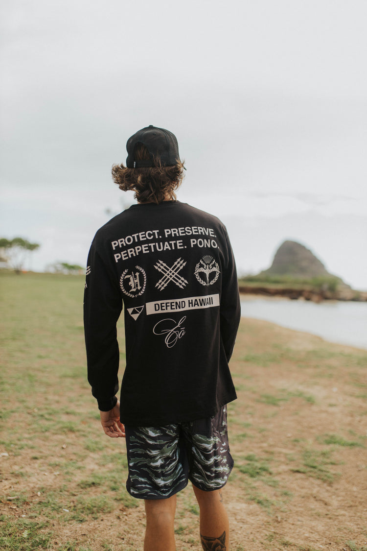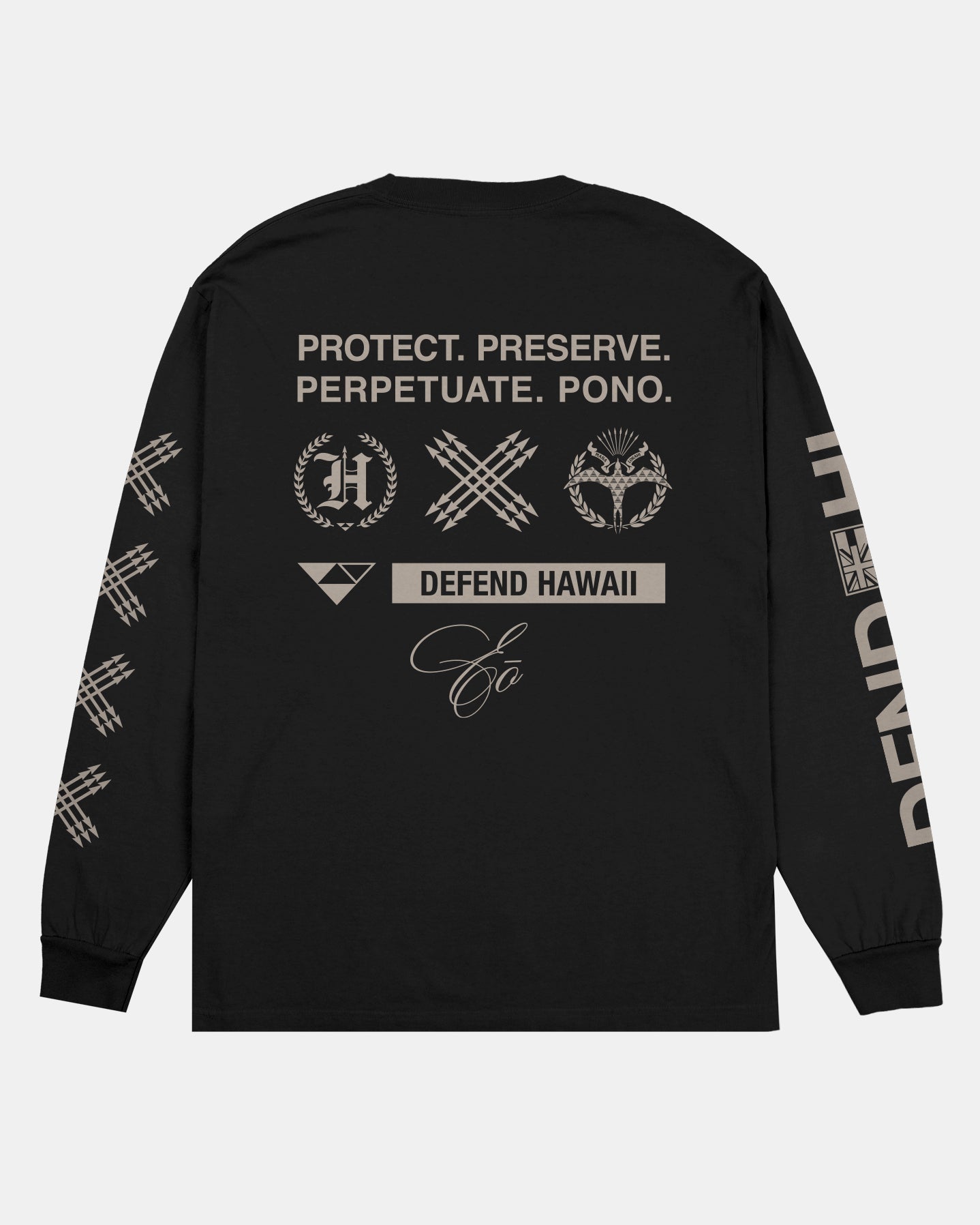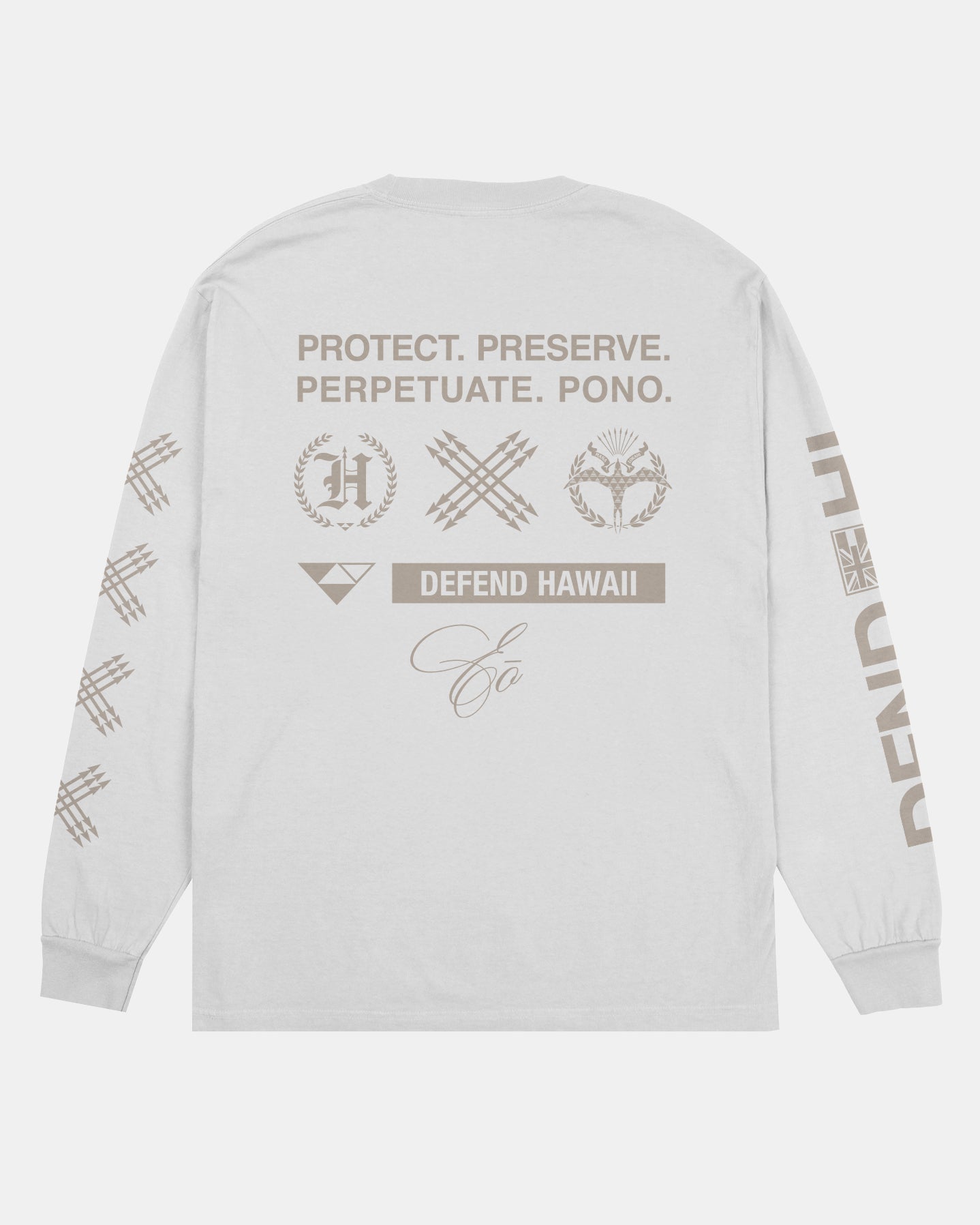 Defend Hawai'i - A full DH logo run, a reminder to protect the culture, by any means necessary. Back with an all over design, this is Protector. Featuring a full chest and back hit, don't miss the double sleeve hit. Pick your favorite colorway. This one comes in light tan ink on a black or white casual fit long sleeve. Your everyday tee to DEFEND with.