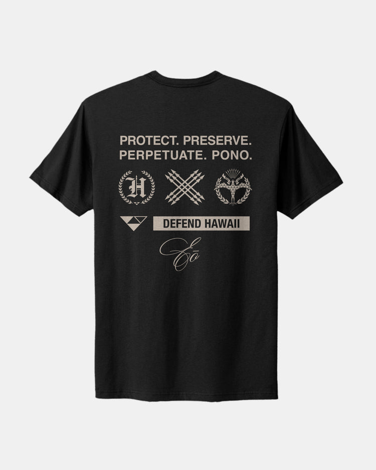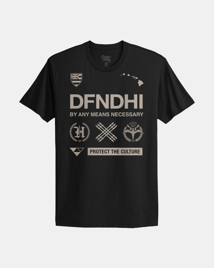 Defend Hawai'i - A full DH logo run, a reminder to protect the culture, by any means necessary. Back with an all over design, this is Protector. Featuring a full chest and back hit, pick your favorite colorway. This one comes in light tan ink on a black premium fit t-shirt. Your everyday tee to DEFEND with.