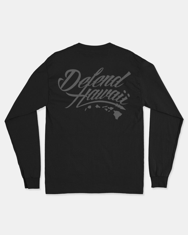 Defend Hawai'i - The iconic, never duplicated, stapled Wildstyle 'Elua logo. Featuring a subtle pocket hit paired with a mayjah back hit in a clean, simple color. Pick your favorite color way, this one comes in gray ink on a black casual fit longsleeve. Your everyday tee to DEFEND with.