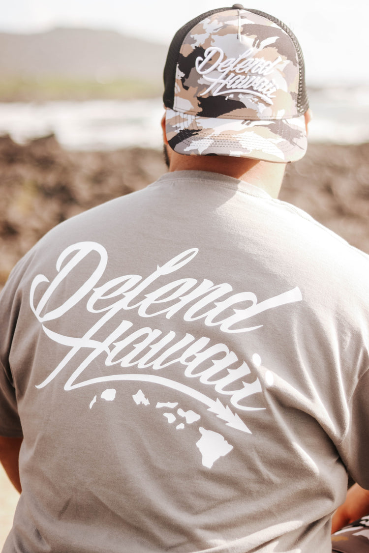 Defend Hawai'i - The iconic, never duplicated, stapled Wildstyle Elua Logo. Featuring a subtle pocket hit paired with a mayjah back hit in a clean, simple color. Pick your favorite color way, this one comes in white ink on a gray casual fit t-shirt. Your everyday tee to DEFEND with.