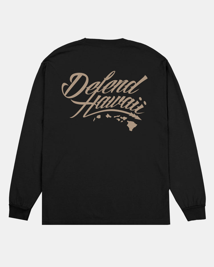 Defend Hawai'i - The iconic, never duplicated, stapled Wildstyle 'Elua logo. Featuring a subtle pocket hit paired with a mayjah back hit in a clean, simple color. Pick your favorite color way, this one comes in tan ink on a black casual fit long sleeve. Your everyday tee to DEFEND with.