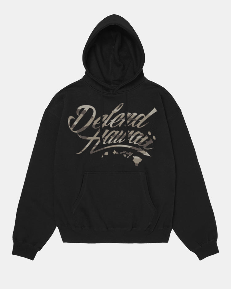Defend Hawai'i - The iconic, never duplicated, stapled Wildstyle logo, this time with a twist for da hunters. Featuring a major front chest hit. Pick your favorite color way, this one comes in tan camo ink on a black midweight fleece pullover hoodie. Your everyday tee to DEFEND with.