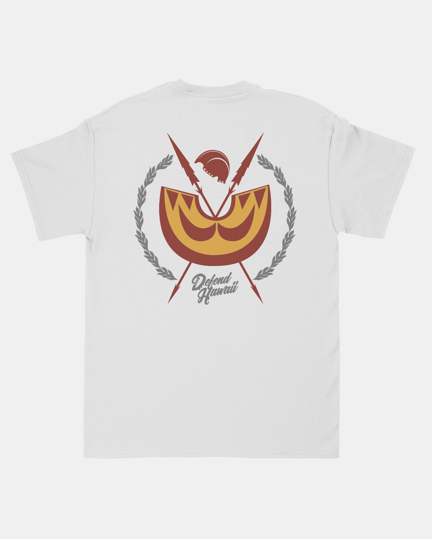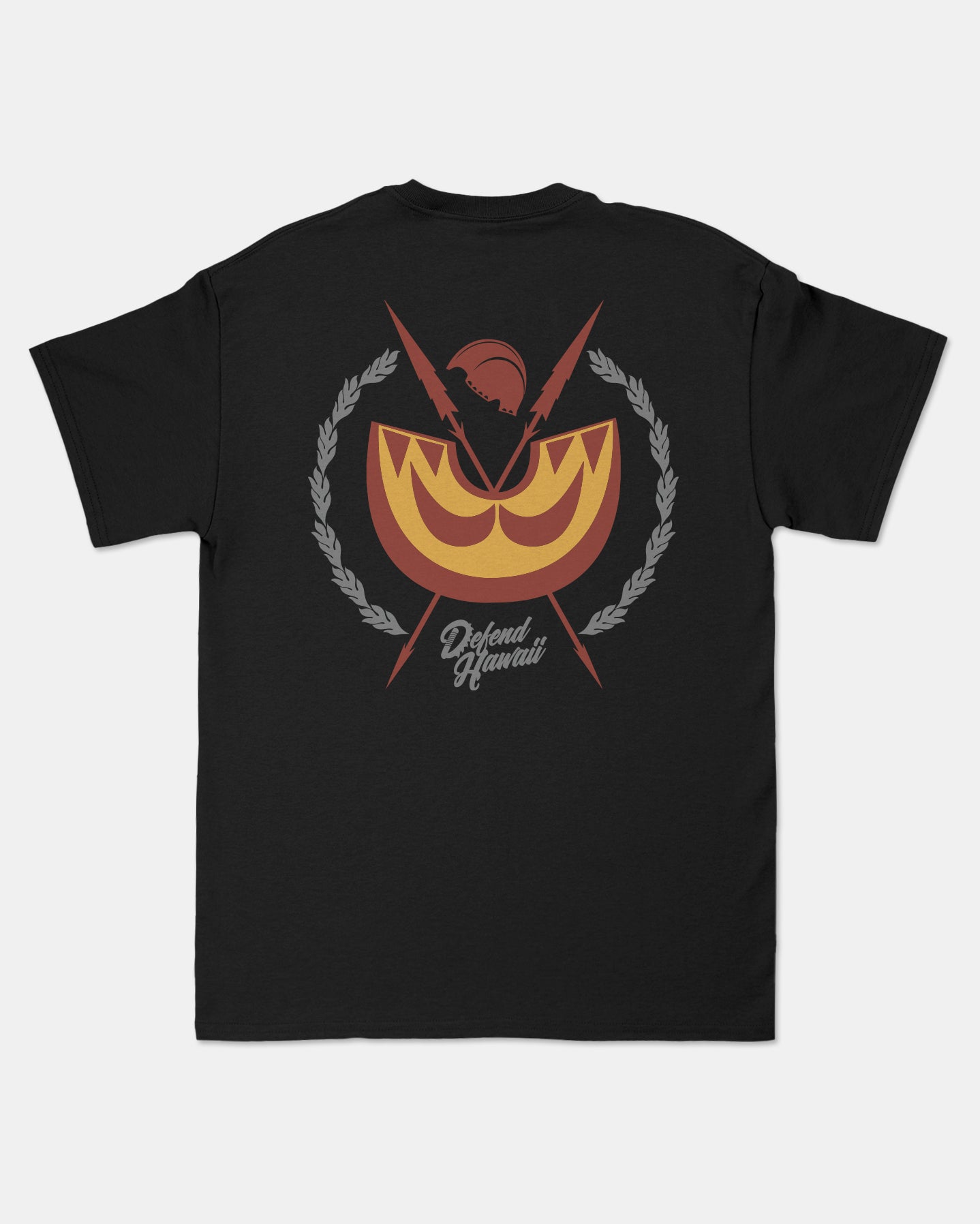 Defend Hawai'i - Armed and ready to defend, this is Ali'i Tings. Shield your chest and back with this double hit tee. Pick your favorite color way, this new installment features a red, yellow, and gray ink design on a black or white casual-fit tee.