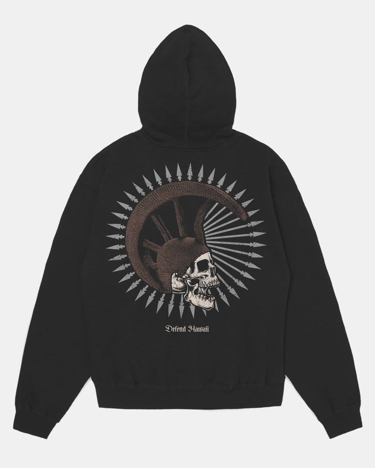 Defend Hawai'i - There's something about the Ali'i Po'o that always gives you a sense of pride. This time as a veteran rebel. This is D-Rebel. Featuring a clean pocket hit and roaring back hit. Pick your favorite colorway. This one comes in gray, brown, and white ink on a black midweight fleece pullover hoodie. Your everyday tee to DEFEND with.