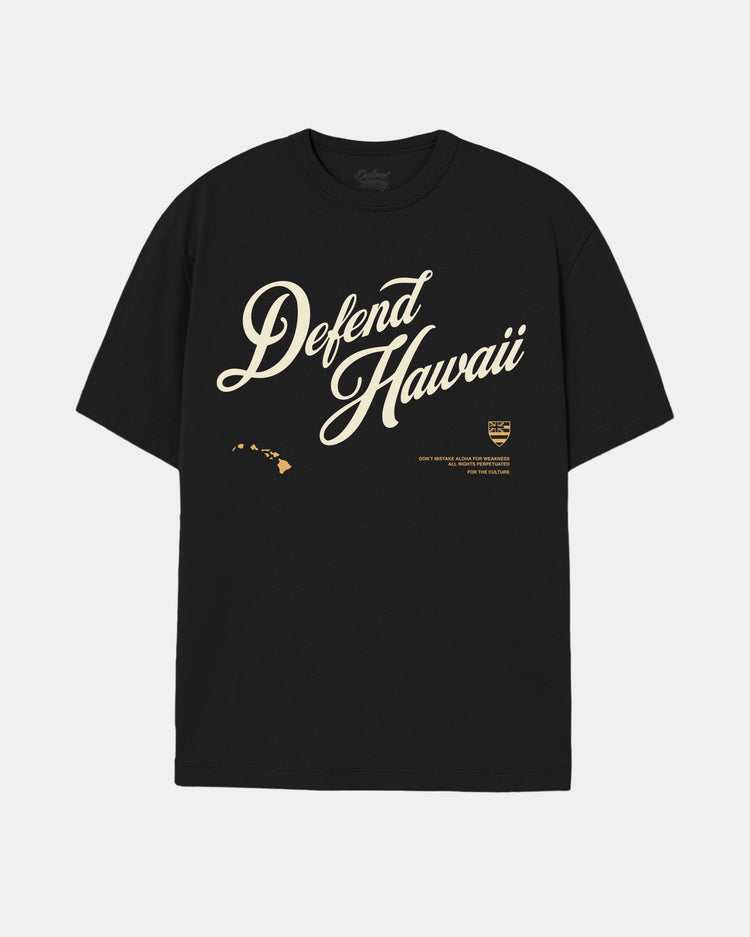Defend Hawai'i -Field Script, featuring a bold chest hit. This one comes in white and yellow ink on a black or red casual fit t-shirt. Your everyday tee to DEFEND with.