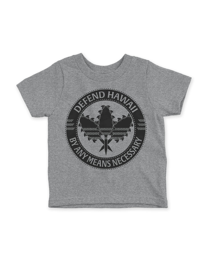 Defend Hawai'i - Bringing back a bold look, the three stripes included. This is Lei O Mano Emblem, this time for da keiki. Pick your favorite color way, this one comes in black ink design on an athletic heather or military green casual-fit kids tee.