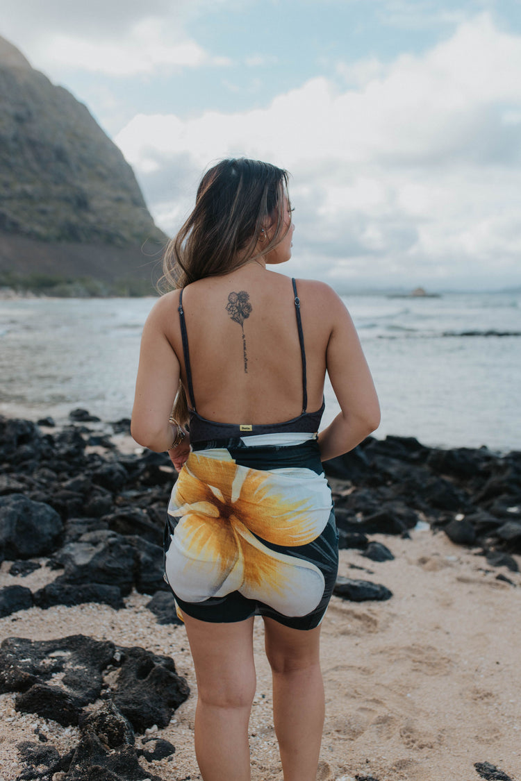 Defend Hawai'i- Our newest Plume Area lightweight pareo. This one comes in a white and yellow on a black background. Perfect for daily or weekly dose of the beach. Hawai'i das why! Wrap it or wear it, these pareos define comfort.