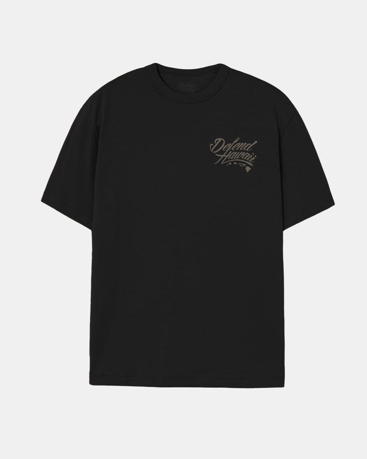 Defend Hawai'i - The iconic, never duplicated, stapled Wildstyle 'Elua logo. Featuring a subtle pocket hit paired with a mayjah back hit in a clean, simple color. Pick your favorite color way, this one comes in dark tan ink on a black or forest green casual fit t-shirt. Your everyday tee to DEFEND with.