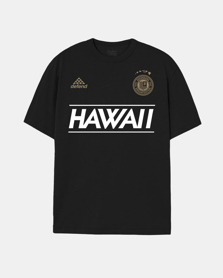 Defend Hawai'i - A sporty all over look, this is HI Goals. Featuring a mayjah chest hit and side back hit. Pick your favorite color way. This comes in white and tan ink on a black or burgundy casual fit tee.