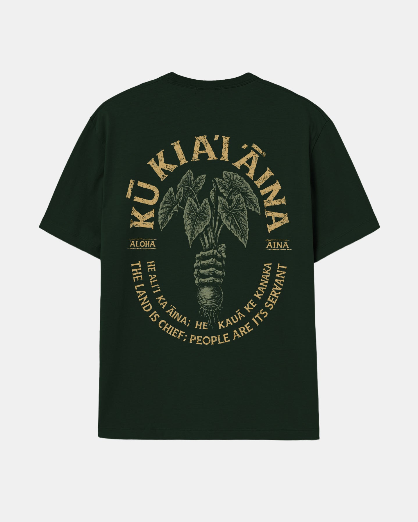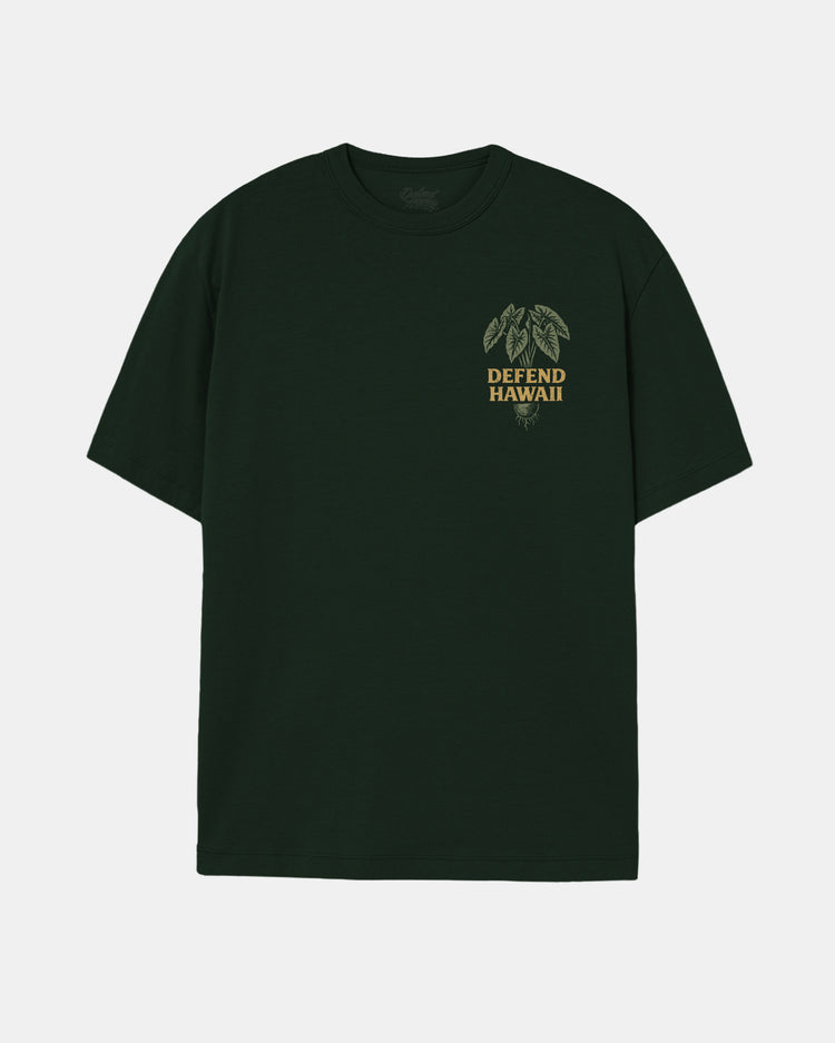 Defend Hawai'i - There are a lot of ways to Defend Hawai'i, but the new Kū Kia'i 'Āina design is for those who like to start at the roots. It's aloha 'āina always. Perfect in or out of the lo'i. Pick your favorite color way. This comes in yellow and green ink on a black or forest green casual fit tee.
