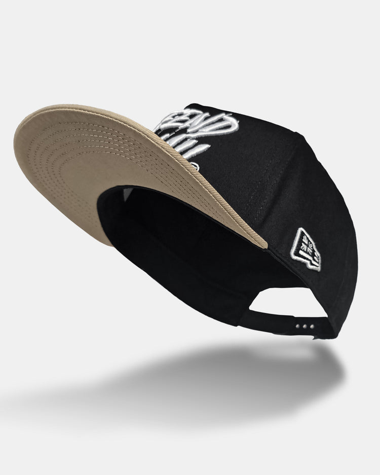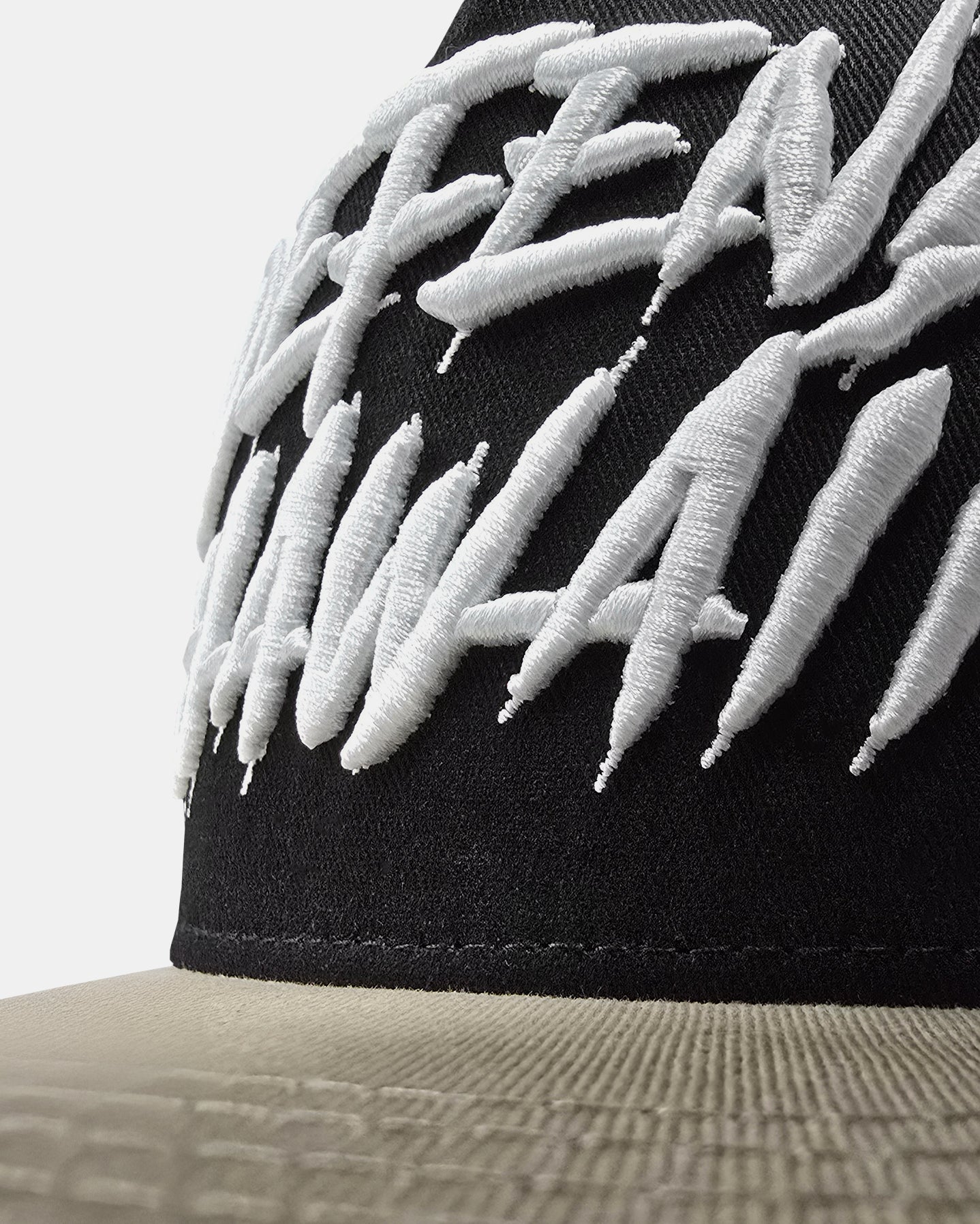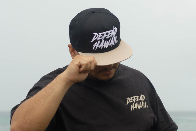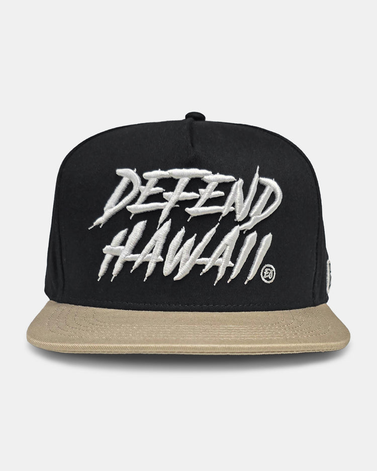 Defend Hawai‘i - Our newest scrappy snapback. The newest Marcher logo embroidered in white on a black snapback. This one is a cotton black flat bill snapback hat, with a black crown, black eyelets, gray brim, and button with a snap closure.
