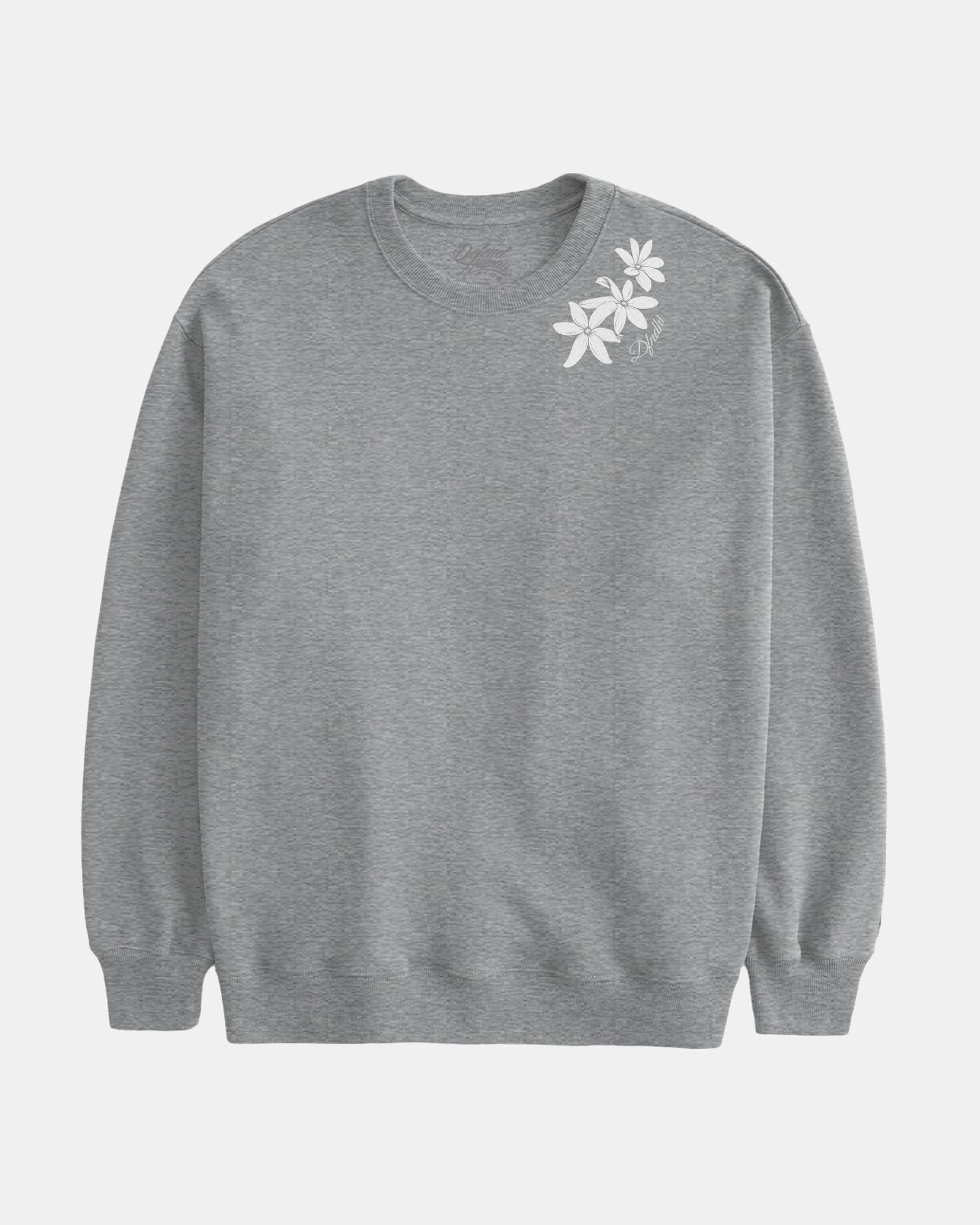 Defend Hawai'i - A flower a day keeps the pests away. This Aloha Tiare always stays fresh. This one comes with freshly picked white ink printed on a heather gray midweight fleece crewneck sweater. Your everyday tee to DEFEND with.