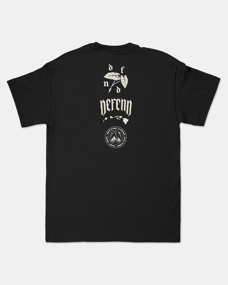 Defend Hawai'i - For those who nourish and make pono use of our natural resources to sustain life in Hawaii and keep our traditions alive. This is for the Kalo Crew. Featuring a wrapped front hit and a natural spine hit. Pick your favorite color way. This one is available in cream ink on a black or brown regular fit tee.