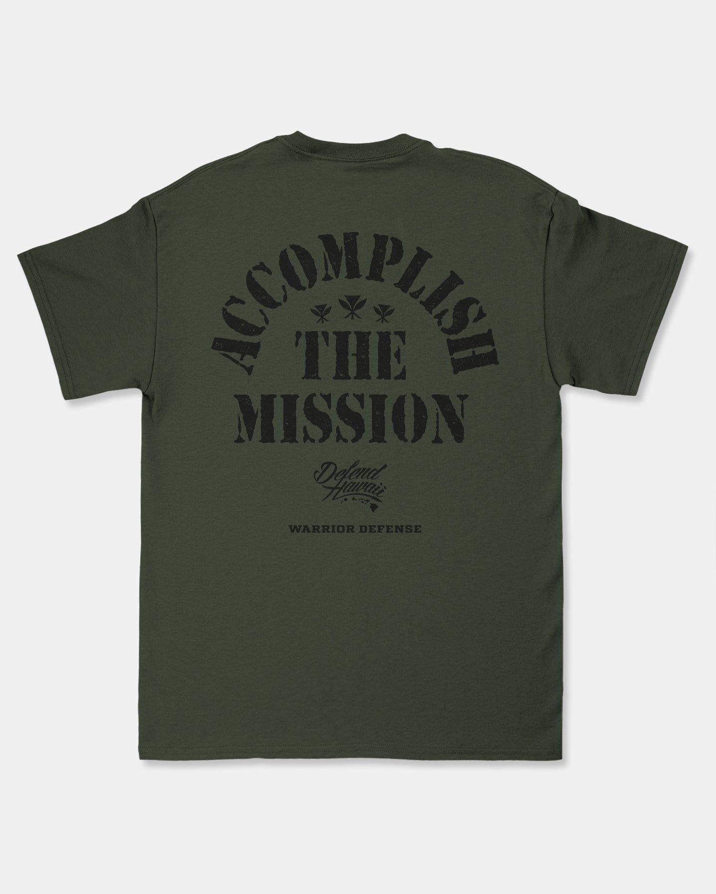 Defend Hawai'i x Rainbow Warrior Defense is back and bolder!  In support of our Home Team defenders, the football defense, and Coach CB, Defend Hawai'i will be donating a portion of the proceeds for each collab product purchased to the UH Football Program. With this one, we ACCOMPLISH THE MISSION. Available in black ink printed on a military green regular fit tee.  This design is also available in a premium tee.