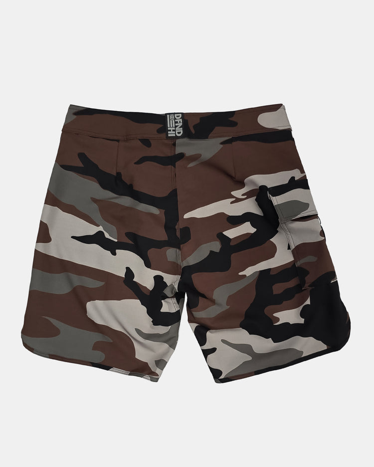 Defend Hawai'i -A classic camo for the daily with the Active City Camo boardshort. A brown, black, and green. Don't miss the black Active Logo down the left leg.