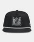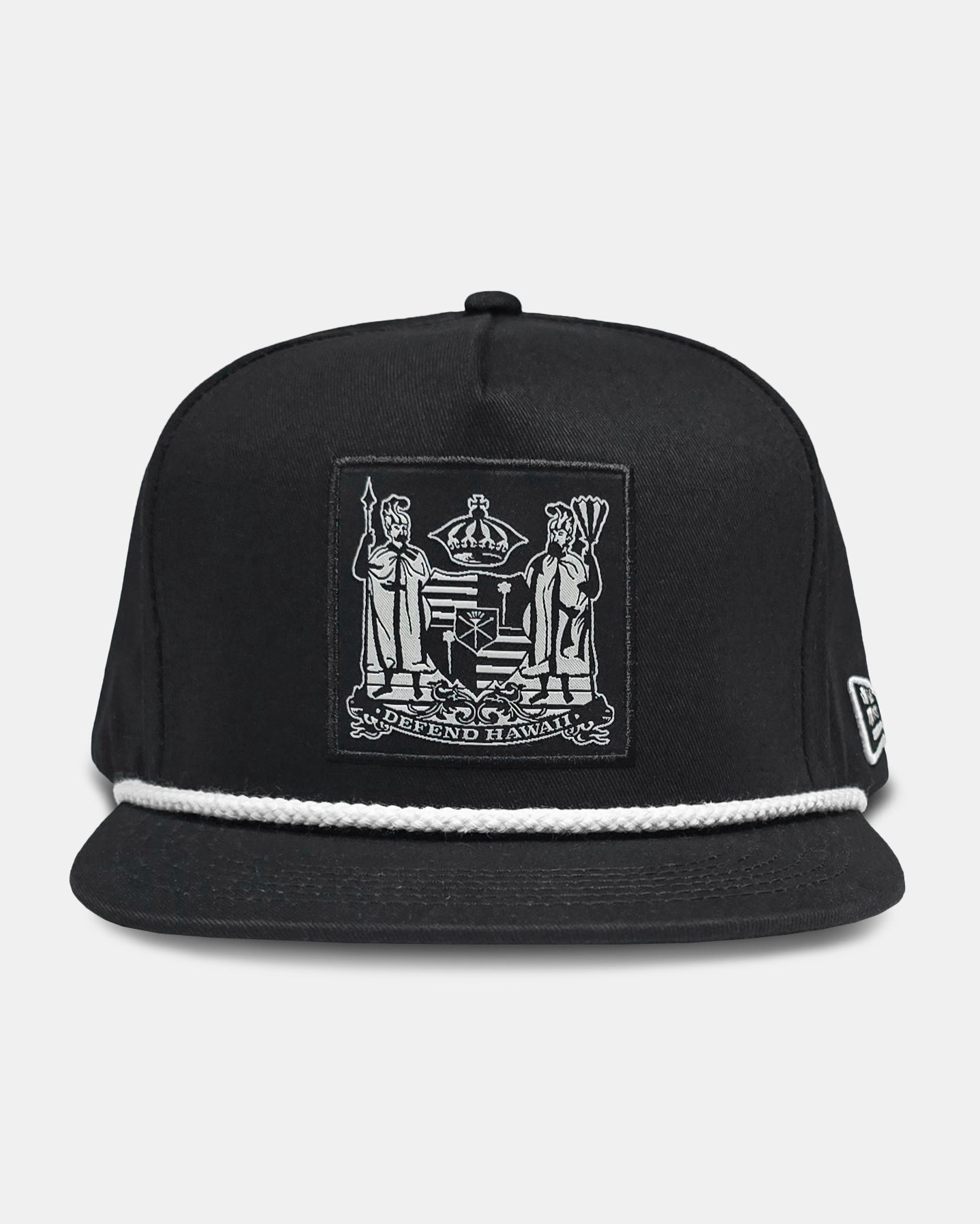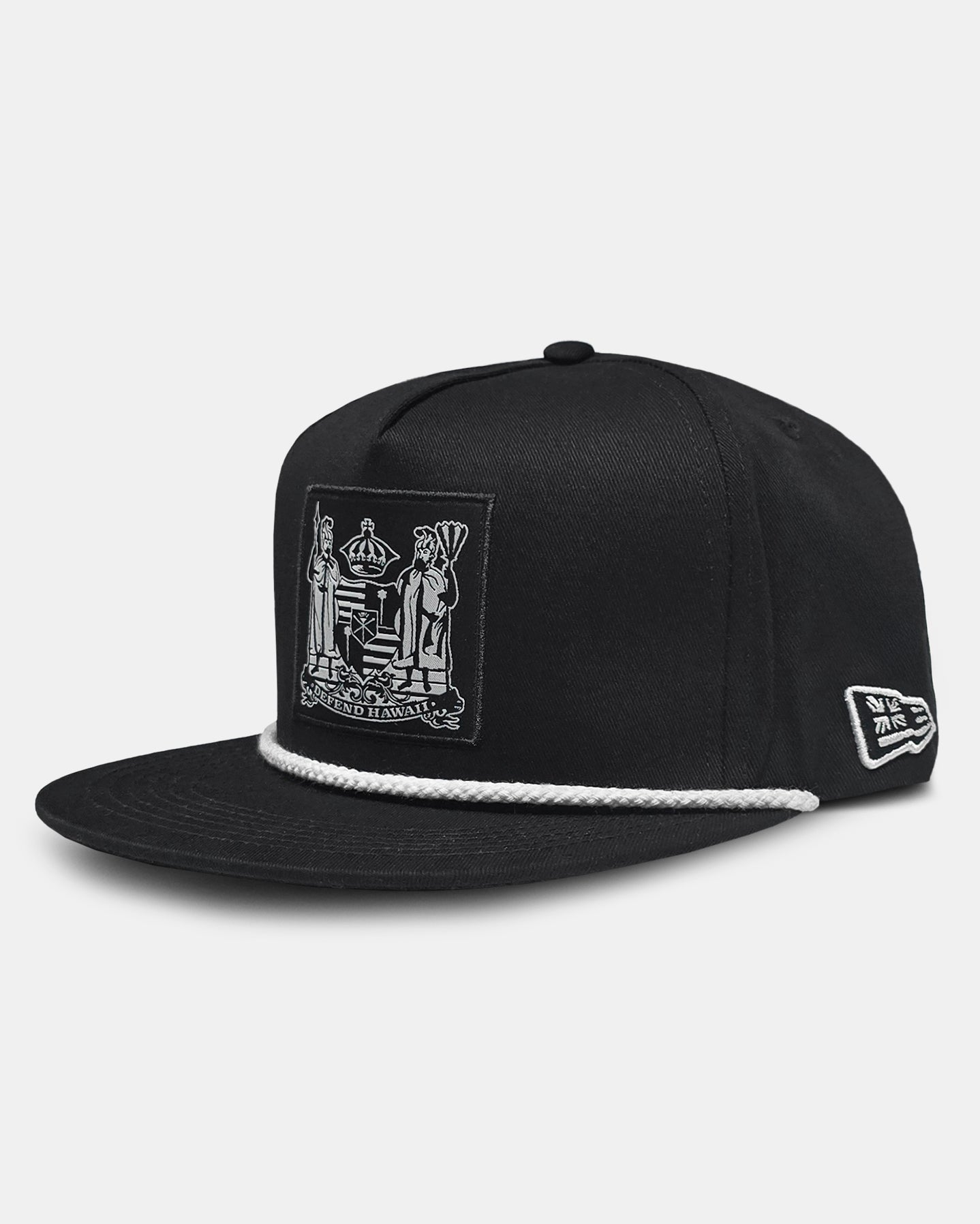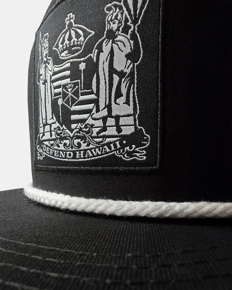 Defend Hawai'i - Our newest headwear drop with our Crest snapback, a bold logo in white on a black base. This one is a cotton casual fit snapback hat, with a black crown and white rope, black eyelets, black brim, and button with a snap closure.