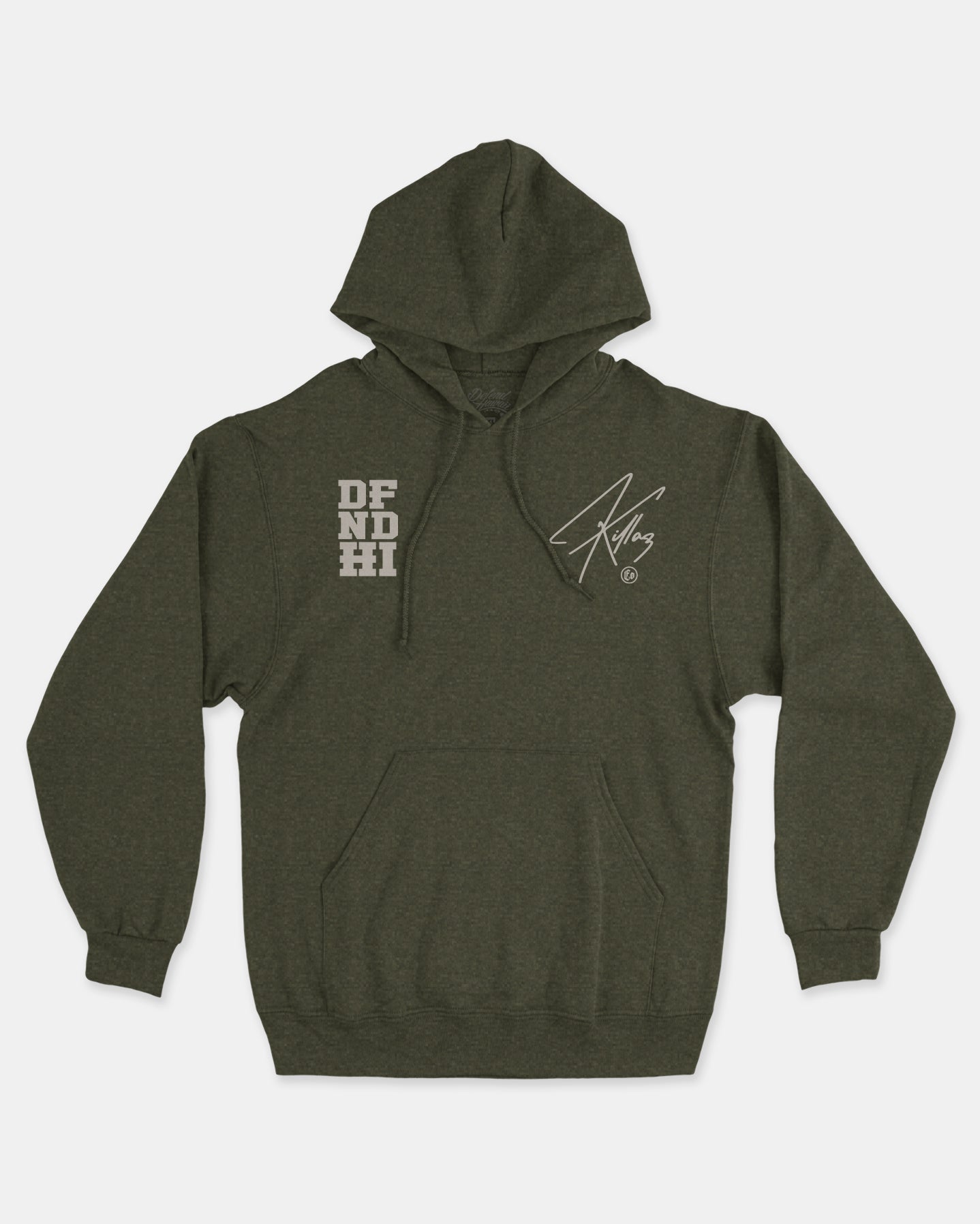 Defend Hawai'i - A new addition to our eradicators saga for da boar huntahz, and an homage to the huntin dogs. This is DFNDHI Killaz. Featuring a double pocket hit and rowdy back hit. Pick your favorite color way. This one comes in gray and natural ink on a green heather medium fleece pullover hoodie.
