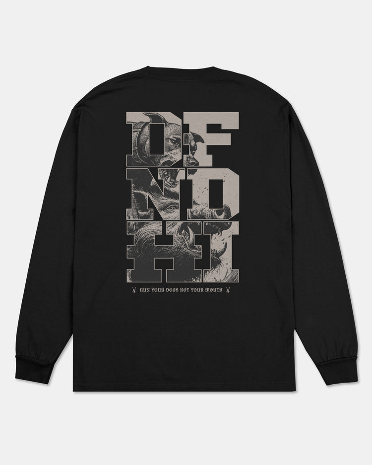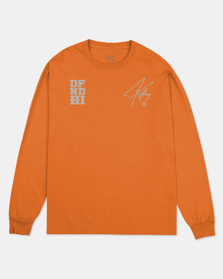 Defend Hawai'i - A new addition to our eradicators saga for da boar huntahz, and an homage to the huntin dogs. This is DFNDHI Killaz. Featuring a double pocket hit and rowdy back hit. Pick your favorite color way. This one comes in gray and natural ink on a black or safety orange casual-fit long sleeve.