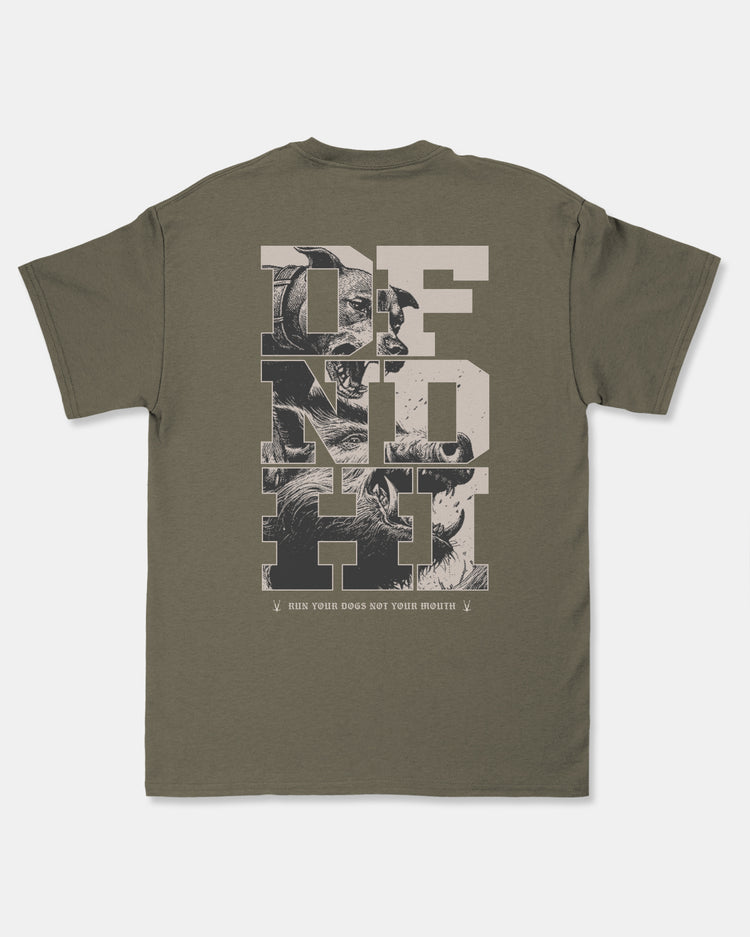 Defend Hawai'i - A new addition to our eradicators saga for da boar huntahz, and an homage to the huntin dogs. This is DFNDHI Killaz. Featuring a double pocket hit and rowdy back hit. Pick your favorite color way. This one comes in gray and natural ink on a black or prairie dust casual-fit tee.