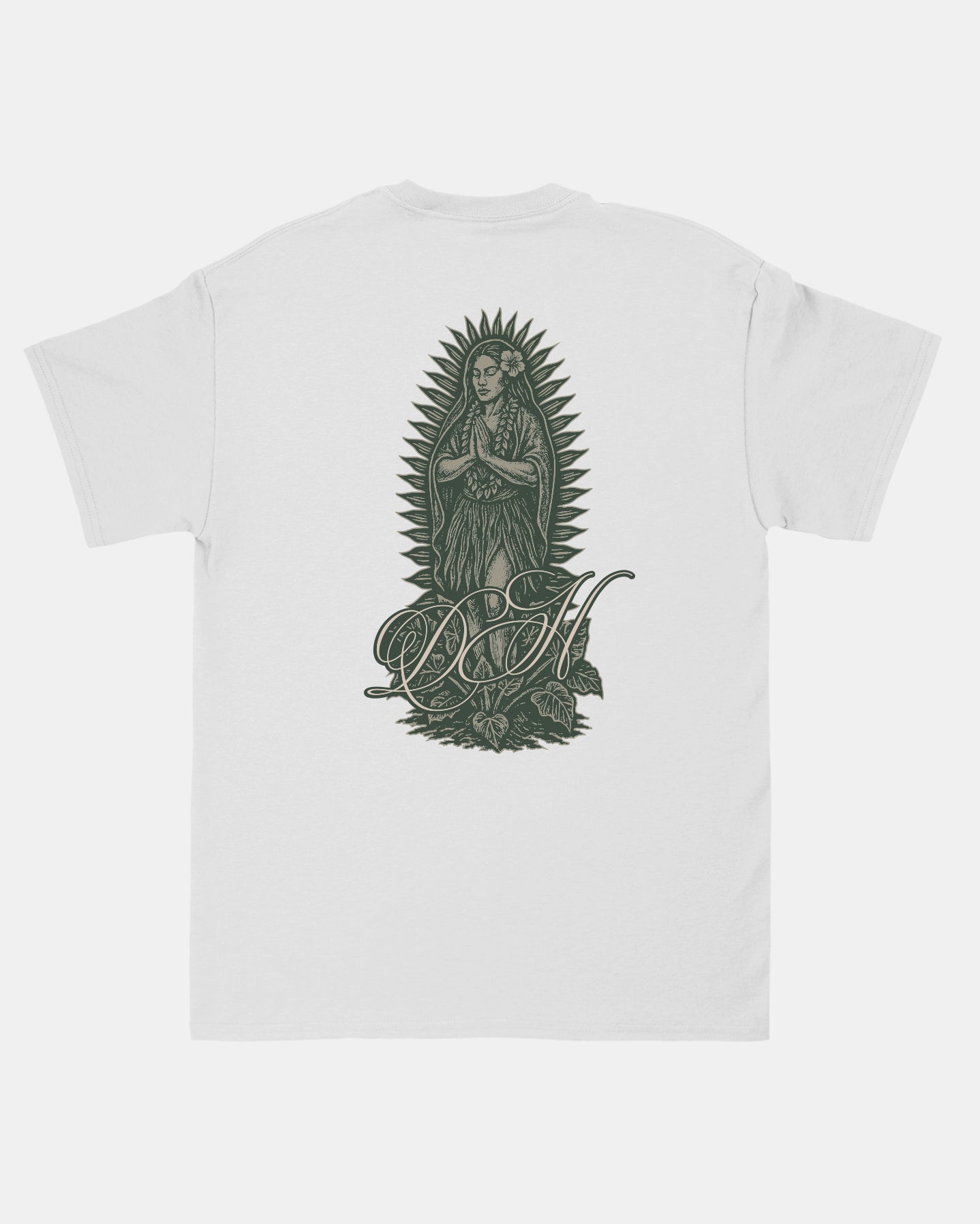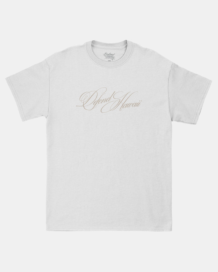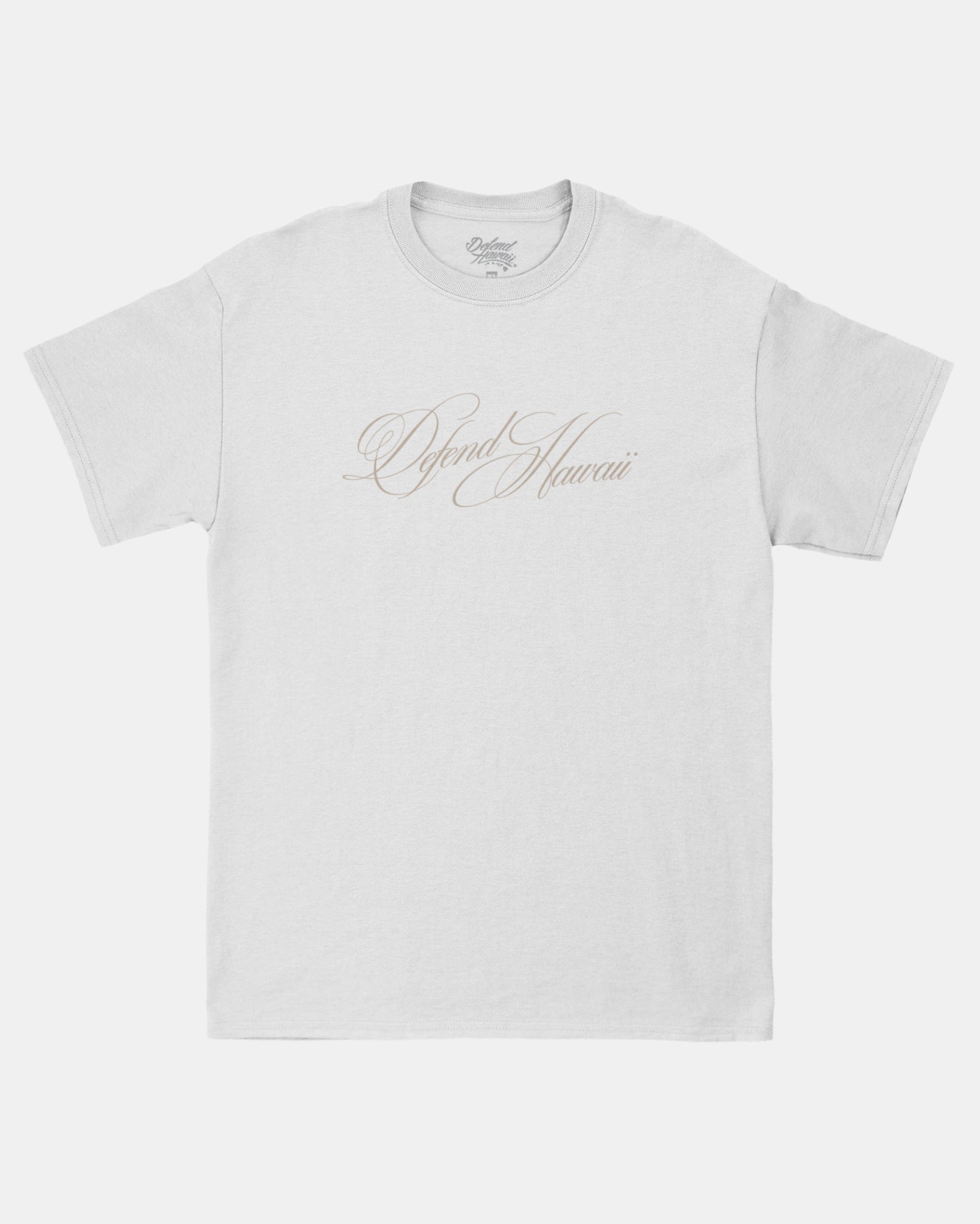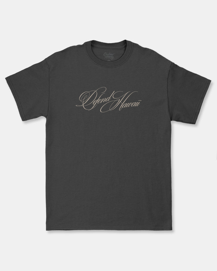 Defend Hawai'i - An earthy tribute and a call to prayer. This is our beloved E Pule Kakou. Featuring a center script and a holy back hit. Pick your favorite colorway, this one comes in tan and green ink on a black, white, or charcoal casual fit t-shirt. Your everyday tee to DEFEND with.