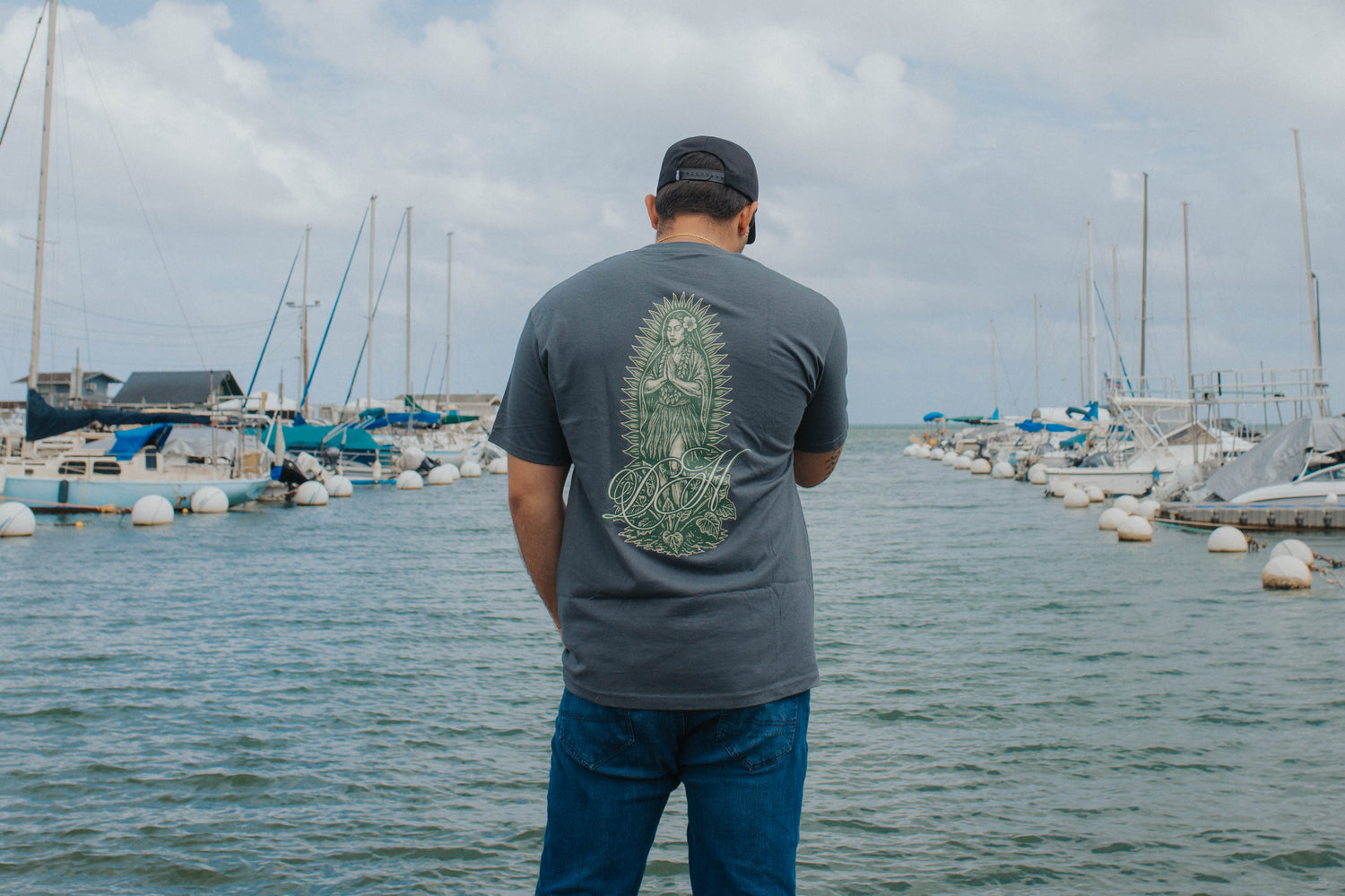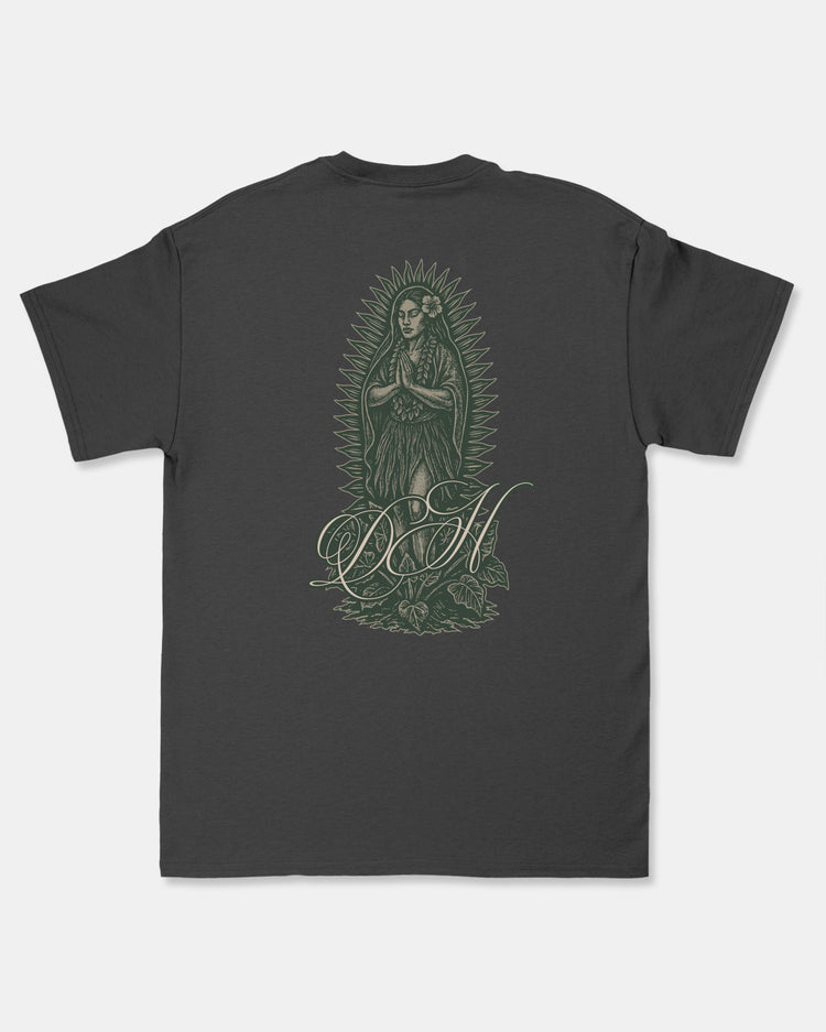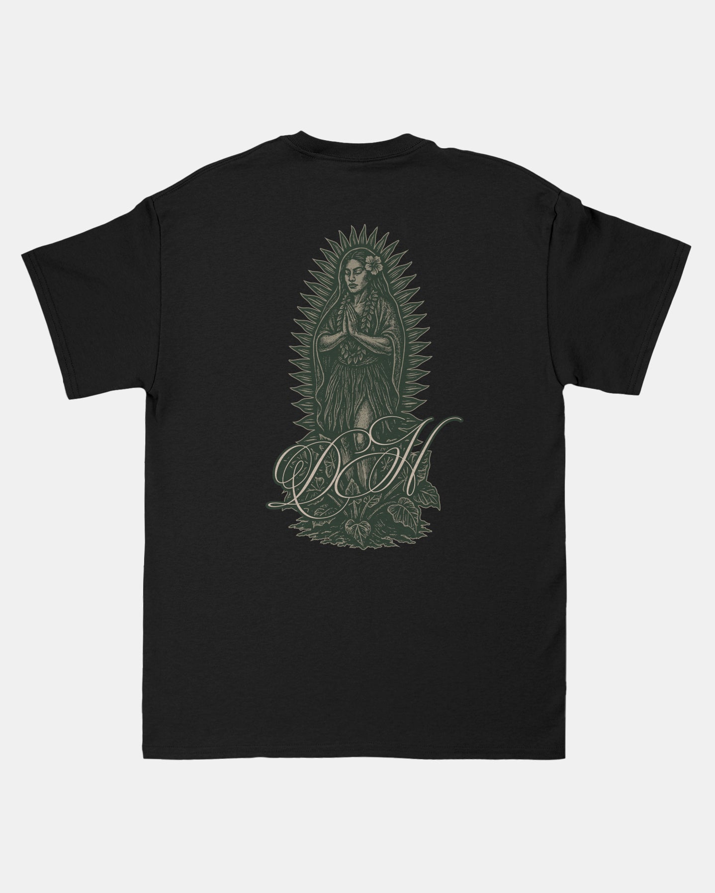 Defend Hawai'i - An earthy tribute and a call to prayer. This is our beloved E Pule Kakou. Featuring a center script and a holy back hit. Pick your favorite colorway, this one comes in tan and green ink on a black, white, or charcoal casual fit t-shirt. Your everyday tee to DEFEND with.