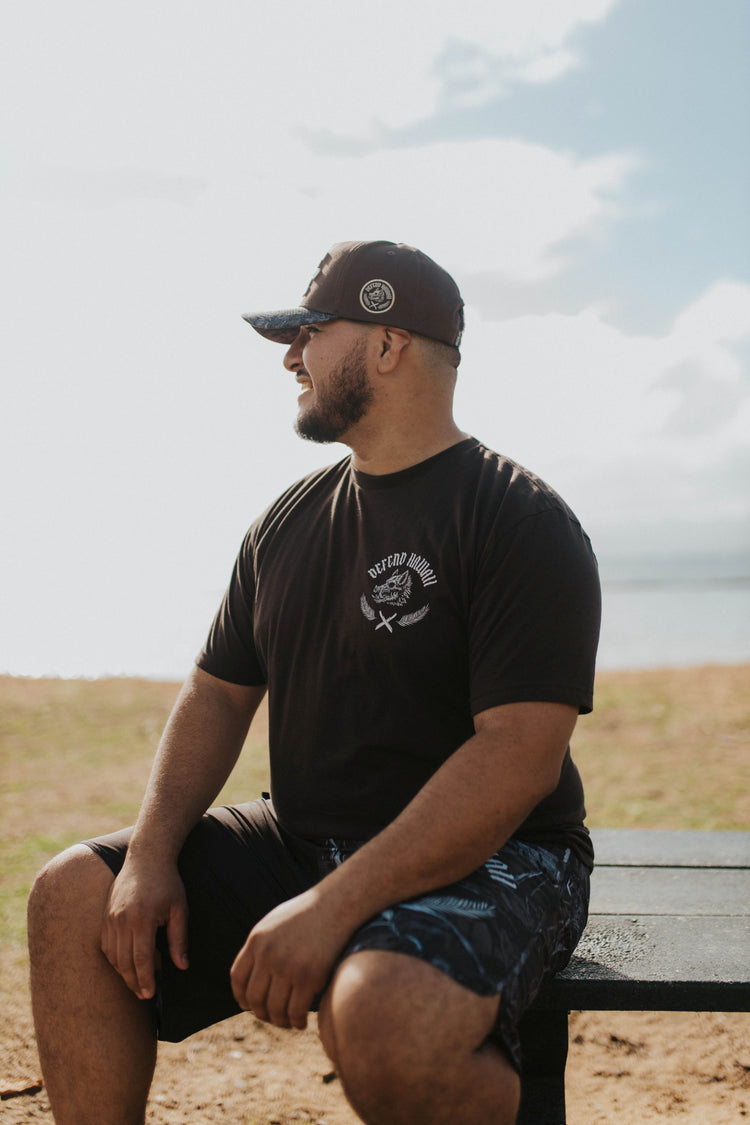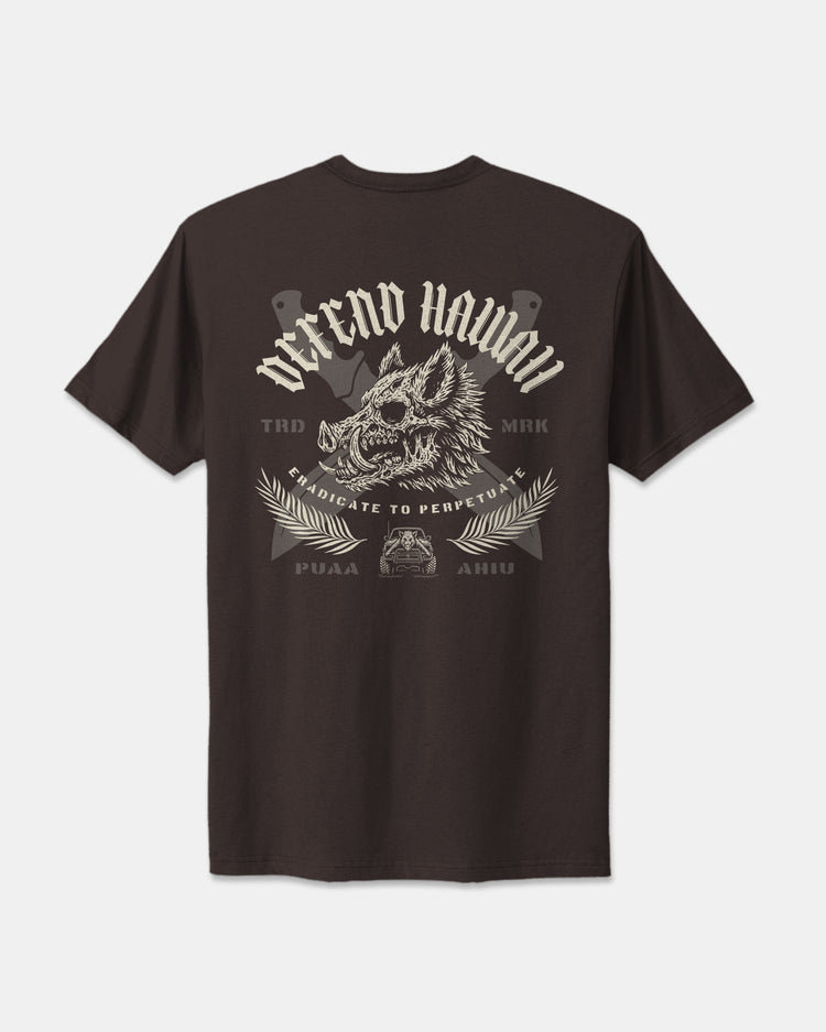 Defend Hawai'i - A new addition to our eradicators saga for da boar huntahz, and an homage to the huntin dogs. This is E2P Zombie. Pick your favorite colorway, this one comes in sand and gray ink on a brown premium fit t-shirt. Your everyday tee to DEFEND with.