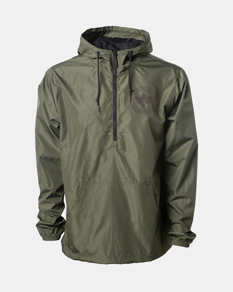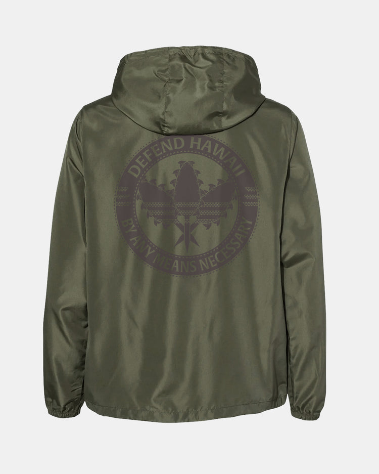 Defend Hawai'i - Bringing back a bold look, the three stripes included. This is Lei O Mano Emblem. Pick your favorite color way, this one comes in dark gray ink design on a military green lightweight nylon anorak windbreaker.